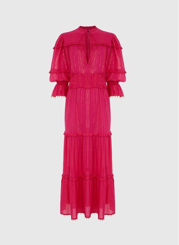 Confeccionado em algodão com fios de lurex, o Vestido possui modelagem evasê, gola semi alta com franzidos e alças para amarração frontal, decote em V, mangas longas bufantes, babados, cinto de lastex na cintura, comprimento midi, barra com mini miçangas e acabamento pespontado.
