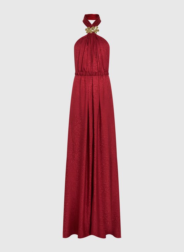 O Vestido é confeccionado em tecido plano com padronagem jacquard, possui caimento reto, modelo frente única com broche metálico no decote, busto com detalhes franzidos, forro interno, comprimento longo e acabamento pespontado.