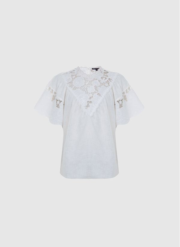 Confeccionada em linho, a Blusa possui gola redonda, mangas curtas amplas, detalhe de renda aplicada com transparência, fechamento posterior por botões e acabamento pespontado.