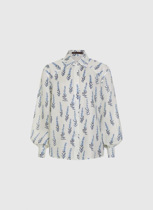 Confeccionada em linho com estampa floral, a Camisa possui modelagem reta, gola com colarinho, fechamento frontal por botões com vista sobreposta, mangas longas bufantes com abotoamento duplo nos punhos, detalhe posterior de prega, barra arredondada e acabamento pespontado.