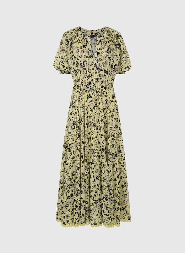 O Vestido é confeccionado em algodão, possui modelagem evasê, padronagem estampada, caimento acinturado, decote em V com franzido, mangas bufantes 3/4, elástico e regulagem na cintura, camadas com babados e franzidos, bolsos faca nas laterais, comprimento midi e acabamento rendado.
