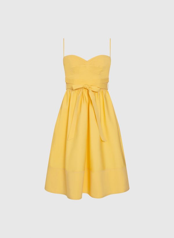 O Vestido é confeccionado em tricoline, possui modelagem evasê, caimento acinturado, alças finas, decote coração com plissados, cintura com passantes laterais e detalhes franzidos, bolsos laterais modelo faca, fechamento posterior por zíper, lastex posterior, barra aplicada, comprimento curto e acabamento pespontado.