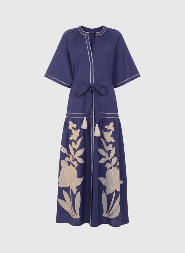 O Vestido é confeccionado em algodão com toque de linho, possui bordado com entremeios, modelagem evasê, mangas curtas, fechamento frontal, faixa para amarração, comprimento midi e acabamento pespontado.