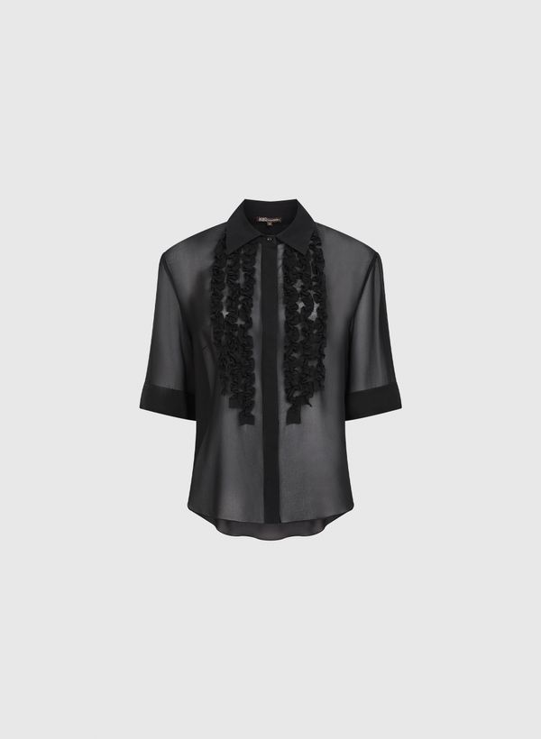 A Blusa é confeccionada em seda, modelagem de camisa, possui transparência, gola com colarinho, fechamento frontal por botões com vista sobreposta, mangas curtas, babados frontais, barra arredondada e acabamento pespontado.