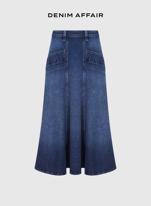 A Saia é confeccionada em jeans, possui lavagem média, modelagem evasê, cós com passantes, dois bolsos frontais, fechamento posterior por zíper, comprimento midi e acabamento pespontado.