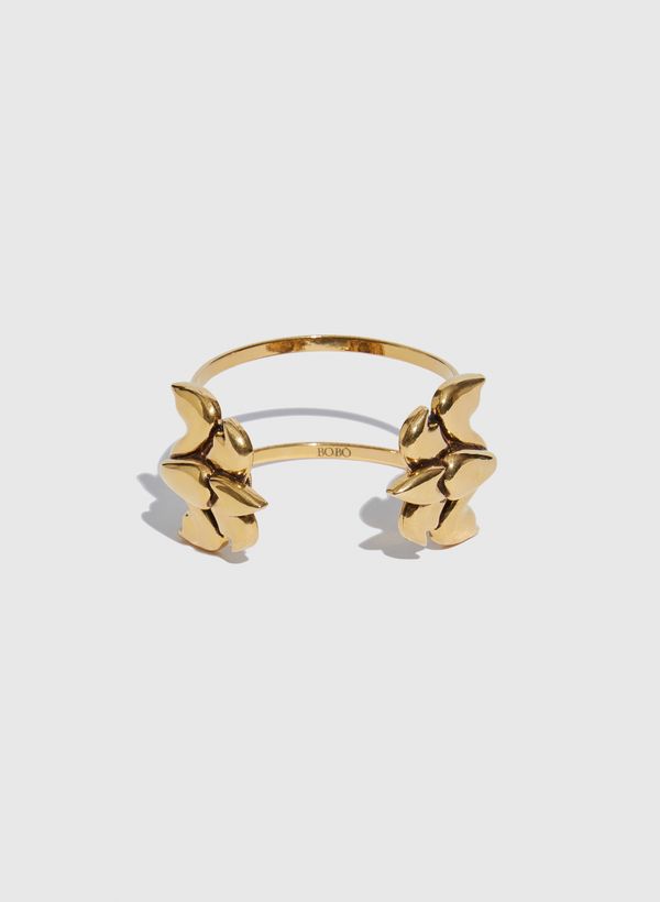 O Bracelete é confeccionado em metal, possui banho ouro vintage, shape cuff vazado, duas flores de lótus esculpidas à mão, logo da marca em laser no interno do bracelete e não há fechamento.