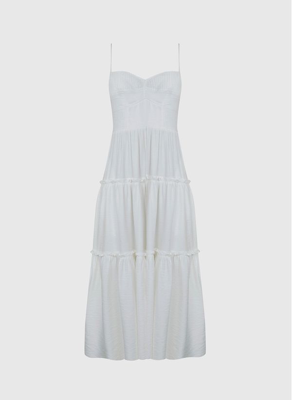 Confeccionado em tecido plano, o Vestido possui modelagem evasê, caimento acinturado, alças finas, decote coração, detalhes franzidos, babados, fechamento posterior por zíper com lastex, comprimento midi e acabamento pespontado.
