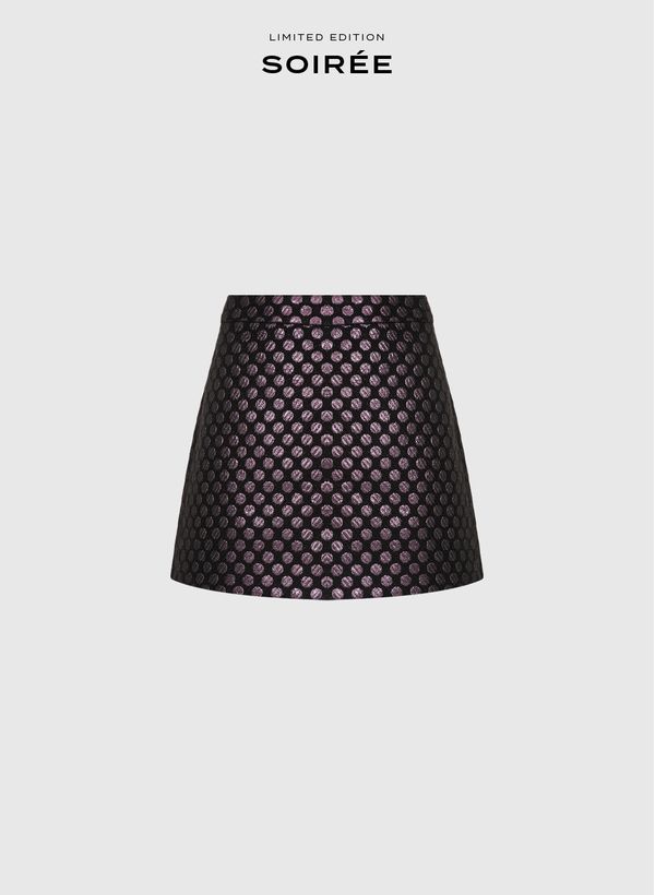 O Shorts Saia é confeccionado em tecido plano com estampa poá metalizada, possui modelagem alfaiataria, fechamento posterior por zíper, comprimento curto e acabamento pespontado.
