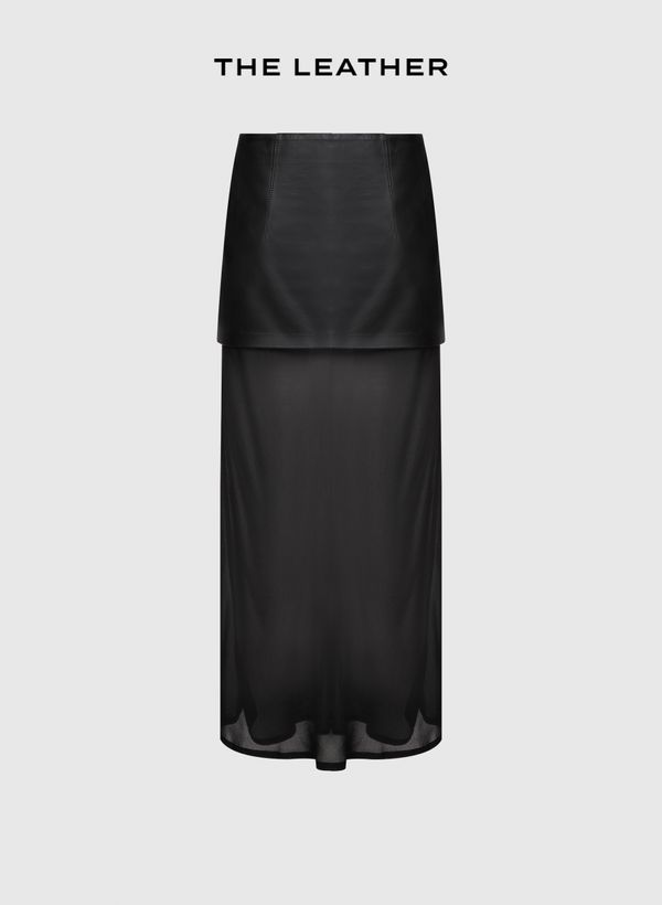 A Saia é confeccionada em couro, possui modelagem reta, detalhe frontal pespontado, cós aplicado com botões de pressão internos, forro longo em crepe removível com leve transparência, fechamento posterior por zíper, comprimento curto e acabamento pespontado.