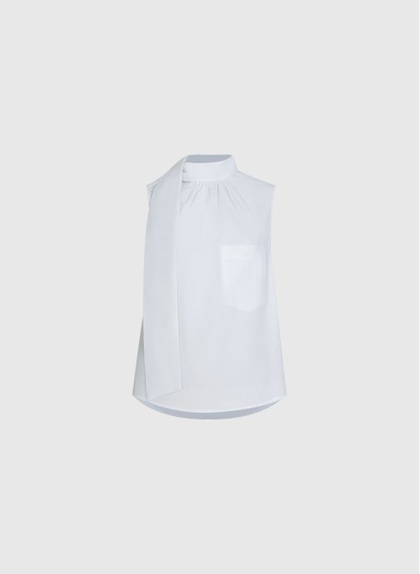 A Blusa é confeccionada em tricoline, possui caimento reto, gola alta continuada até o quadril, detalhes frontais franzidos, alças largas, bolso frontal, barra posterior levemente alongada e acabamento pespontado.