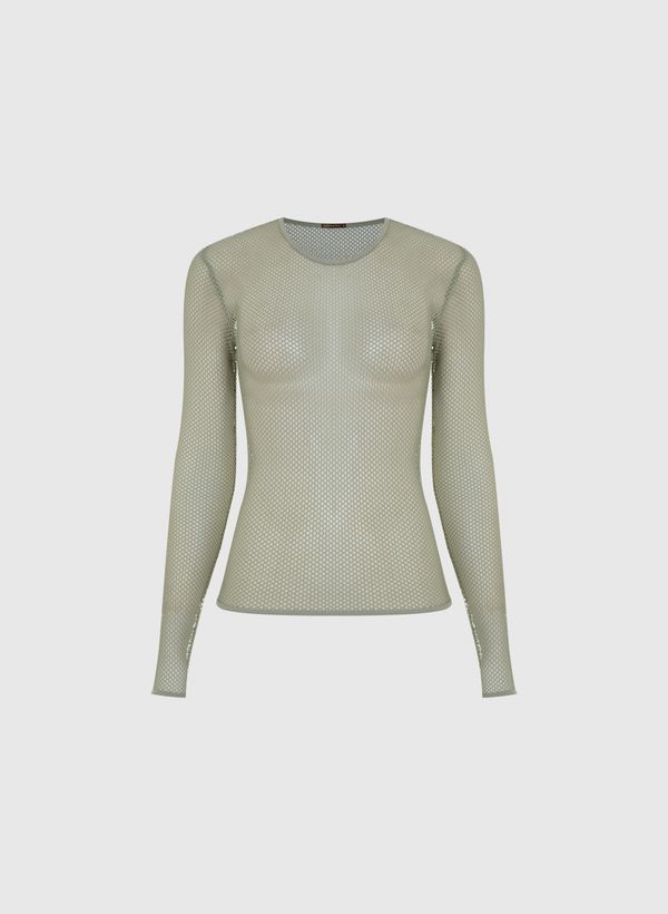 Confeccionada em malha arrastão, a Blusa possui modelagem justa ao corpo, gola redonda, transparência, mangas longas e barra reta.