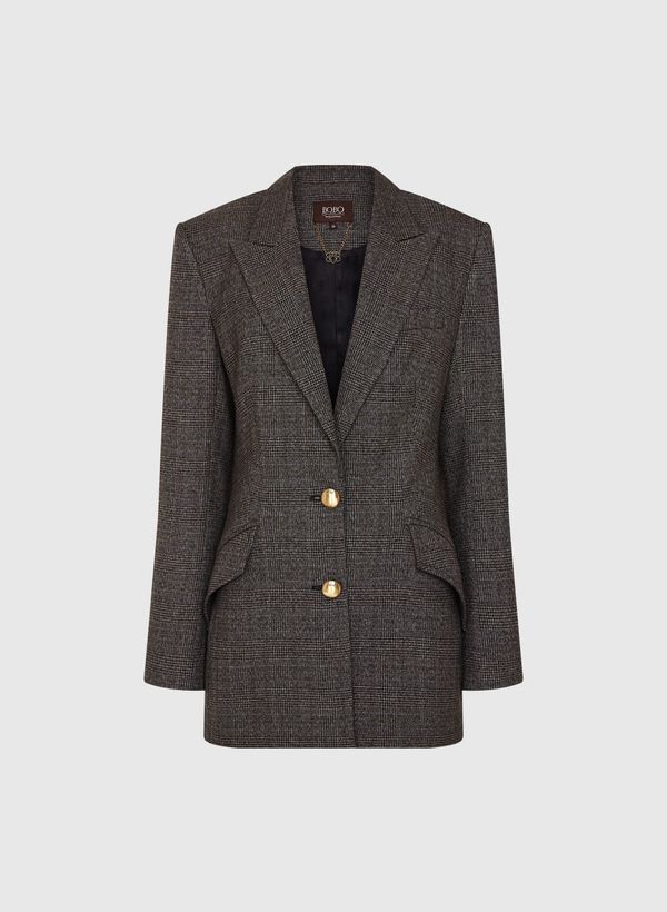 O Blazer é confeccionado em tecido plano, possui padronagem xadrez, modelagem em alfaiataria, caimento reto, dois bolsos frontais com lapelas, mangas longas com abotoamento nos punhos, fechamento frontal por botões metálicos dourados, forro embutido, comprimento alongado e acabamento pespontado.