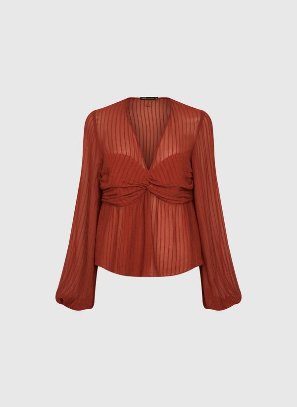A Blusa é confeccionada em viscose com textura risca giz, possui transparência, decote em "V" e busto drapeado, mangas longas bufantes com punho de elástico, detalhe transpassado franzido e acabamento pespontado.