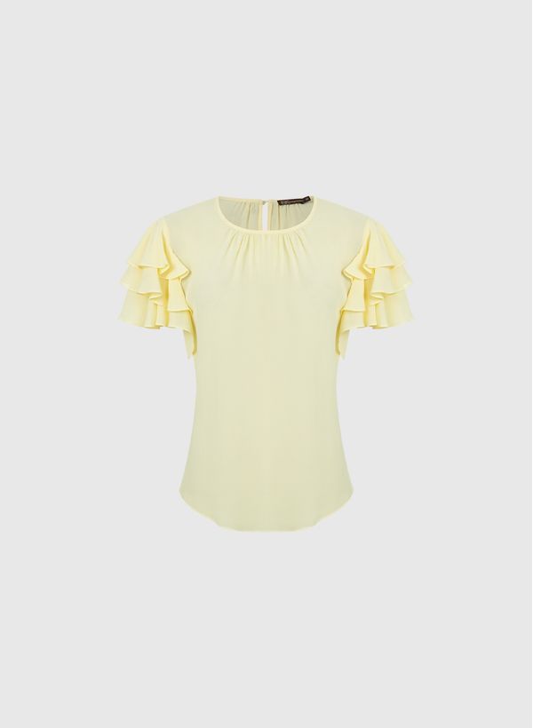 A Blusa é confeccionada em crepe, possui gola redonda com detalhe franzido, transparência, mangas curtas com babados assimétricos em camadas, fechamento posterior por botão e acabamento pespontado.