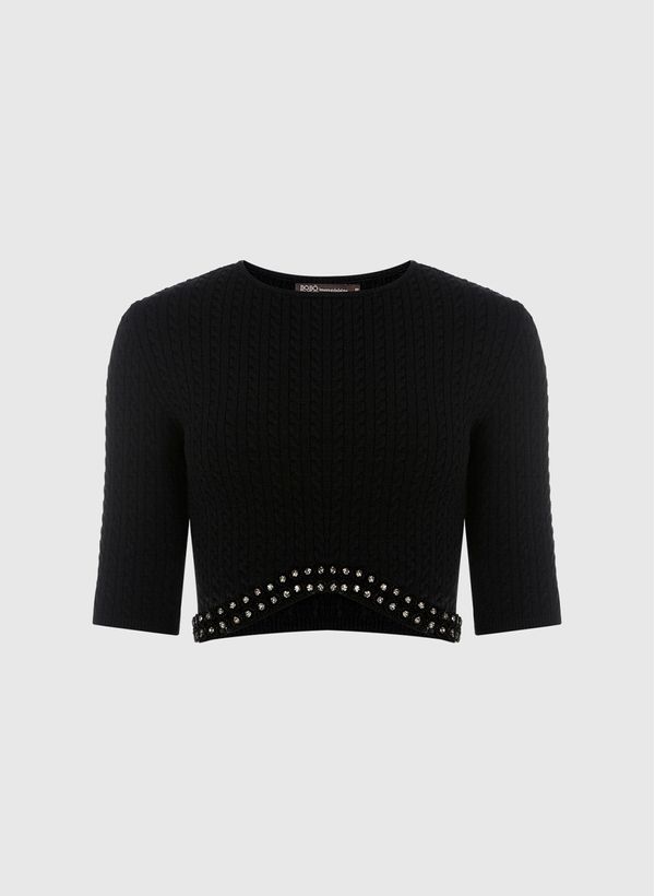 Confeccionada em tricot, a Blusa possui modelagem cropped, decote redondo, mangas médias, aviamento de cristal e paetê na barra e acabamento canelado.