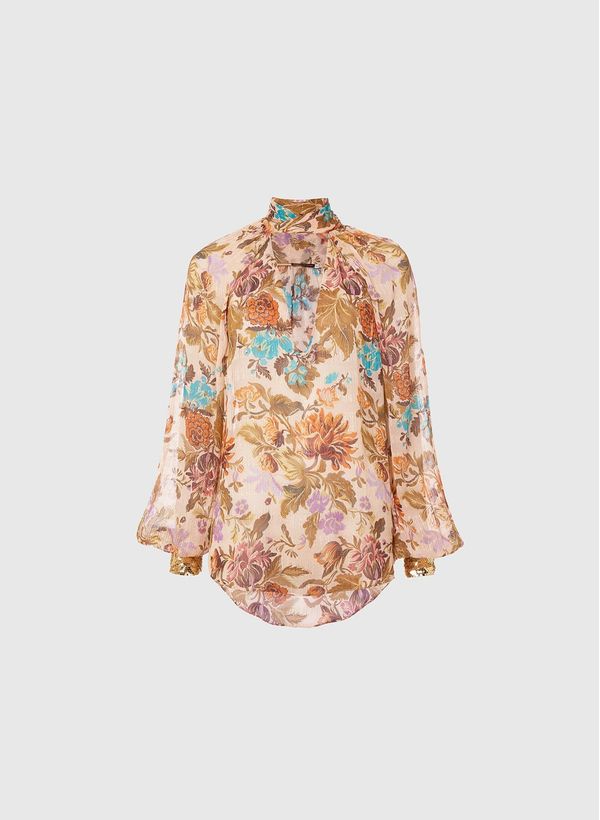Confeccionada em seda com fios metálicos, a Blusa possui estampa floral, gola alta com amarração posterior, detalhe frontal vazado, mangas longas bufantes com paetê nos punhos, barra longtail e acabamento pespontado.
