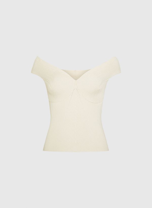 A Blusa é confeccionada em tricot, possui caimento ajustado, decote tomara que caia, mangas curtas e acabamento canelado.