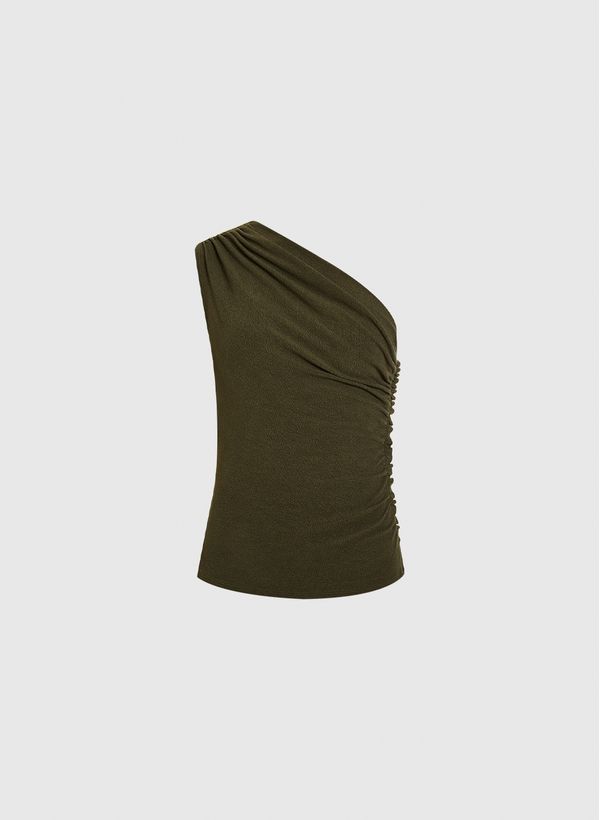A Blusa é confeccionada em malha, possui caimento ajustado ao corpo, decote assimétrico, alça única larga com franzidos, detalhe de babados com franzido na lateral e acabamento pespontado.