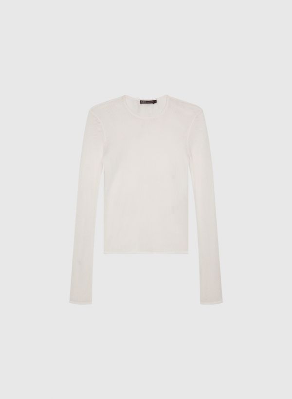 A Blusa é confeccionada em tricot telado, possui transparência, decote redondo, mangas curtas e acabamento canelado.