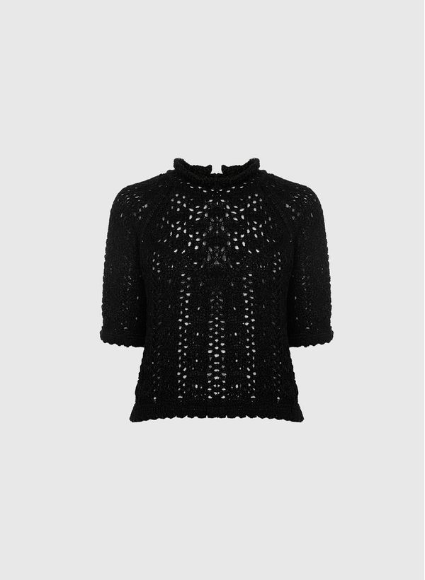 Confeccionada em tricot, a Blusa possui modelagem reta, decote redondo, mangas curtas, detalhes vazados com transparência, fechamento posterior por botão e acabamento canelado.