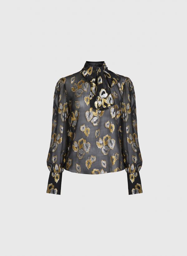 A Blusa é confeccionada em seda jacquard brocada, possui transparência, gola média com amarração, mangas longas com abotoamento nos punhos, lurex aplicado e barra lenço.