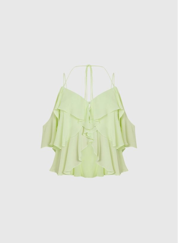 Confeccionada em tecido fluido, a Blusa possui alças finas duplas, decote em "V", mangas curtas, fechamento frontal por botões forrados, aplicação de babados por toda a peça e acabamento pespontado.