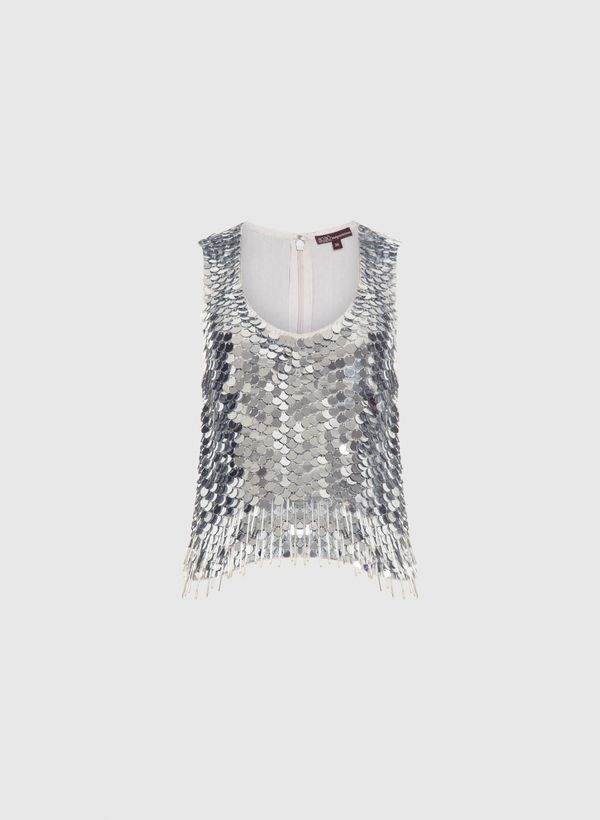A Blusa é confeccionada em viscose, possui aplicações de espelhos metálicos costurados manualmente, decote em “U” com miçangas aplicadas, alças médias, barra com franjas de canutilho e fechamento posterior por zíper invisível.