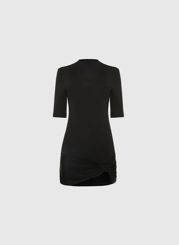 A Blusa é confeccionada em malha jersey, possui modelagem ajustada ao corpo, gola média, mangas curtas, pala frontal com franzido lateral e nó, fechamento posterior por zíper invisível, comprimento alongado e acabamento pespontado.