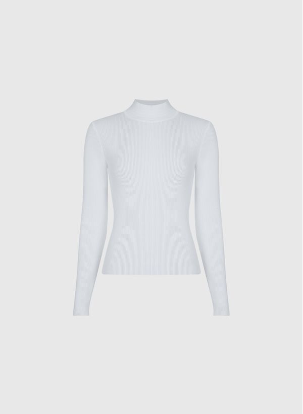A Blusa é confeccionada em tricot, possui modelagem reta, gola alta canelada, mangas longas com detalhes de botões perolados e acabamento canelado.