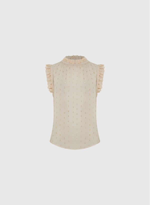 Confeccionada em tecido plano, a Blusa possui modelagem reta, decote redondo, colarinho e mangas com babados aplicados, detalhe de logo metalizado aplicado na parte posterior, barra arredondada e acabamento pespontado.