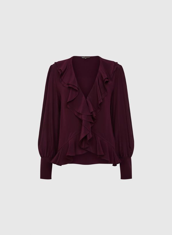 A Blusa é confeccionada em seda, possui decote em "V", mangas longas bufantes com fechamento nos punhos por botão, babados aplicados, amarração nas costas para acinturar, fechamento frontal no decote por botão e acabamento pespontado.