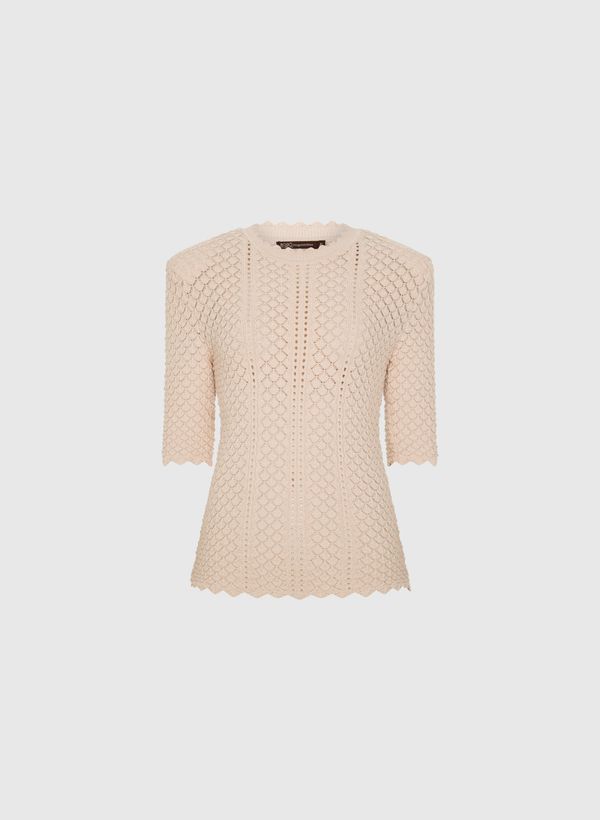 A Blusa é confeccionada em tricot, possui mini vazados, modelagem justa ao corpo, mangas curtas e acabamento canelado com bordas onduladas na gola, nos punhos e na barra.