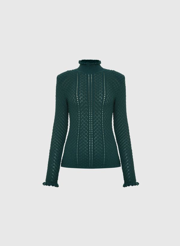 A Blusa é confeccionada em tricot, possui mini vazados, modelagem justa ao corpo, gola alta, mangas longas e acabamento canelado com babados na gola e nos punhos.