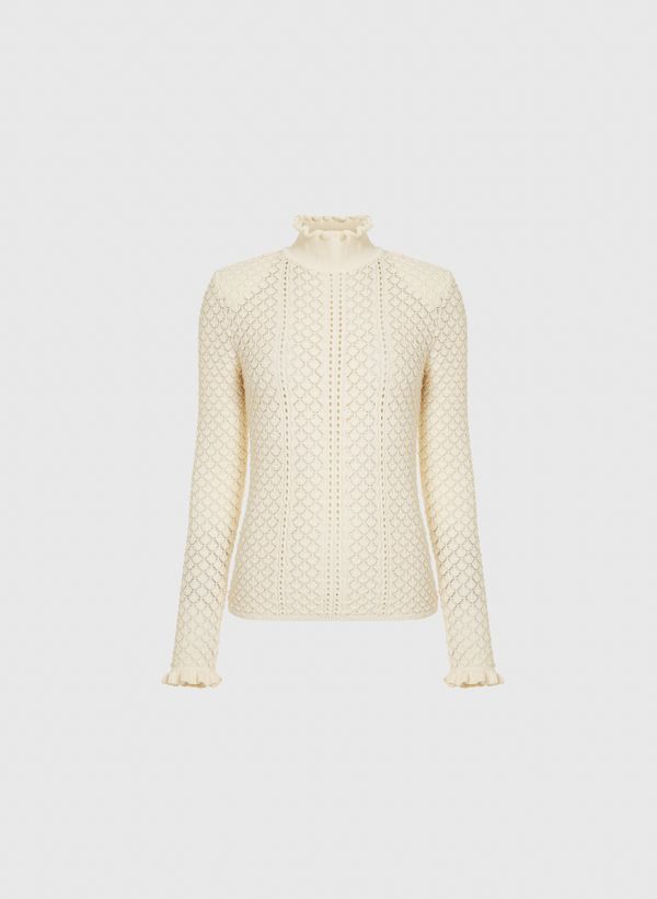 A Blusa é confeccionada em tricot, possui mini vazados, modelagem justa ao corpo, gola alta, mangas longas e acabamento canelado com babados na gola e nos punhos