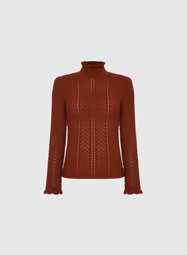 A Blusa é confeccionada em tricot, possui mini vazados, modelagem justa ao corpo, gola alta, mangas longas e acabamento canelado com babados na gola e nos punhos.