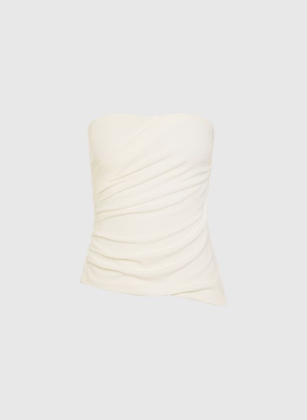A Blusa é confeccionada em malha, modelo off shoulder, detalhe de franzidos na lateral, barra assimétrica, fenda na barra lateral, fechamento lateral por zíper invisível e acabamento pespontado.