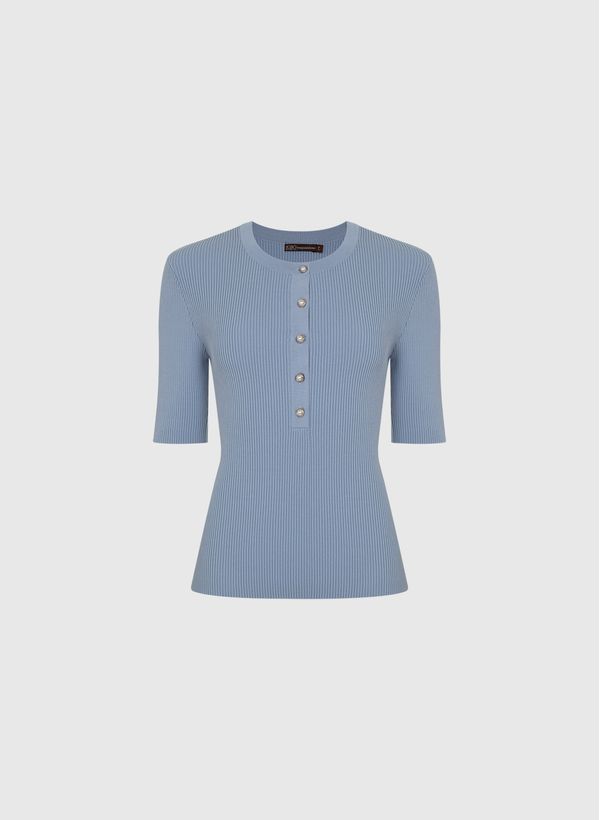 Confeccionada em tricot, a Blusa possui caimento ajustado ao corpo, decote em "V", fechamento por botões perolados frontal, mangas 2/4, detalhe exclusivo de logo metalizado aplicado posterior e acabamento canelado.