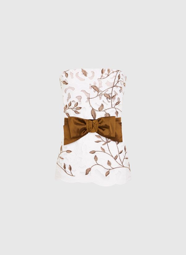 A Blusa é confeccionada em tela rebordada, possui bordados florais em relevo e ramos contrastantes, leve transparência, modelo tomara que caia, forro interno, barra ondulação e acabamento do barrado do tecido.