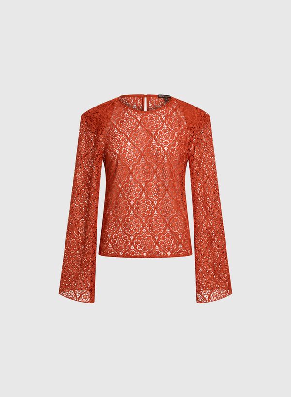 A Blusa é confeccionada em renda guipir com padronagem floral, possui transparência, decote redondo, mangas longas, ombreiras internas e fechamento posterior de gota com botão forrado.