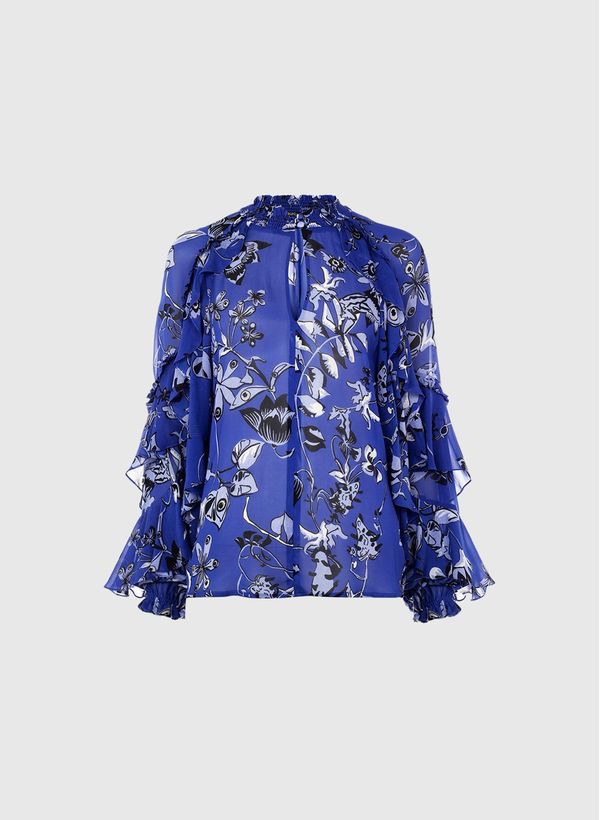Confeccionada em tecido plano, a Blusa possui padronagem floral, caimento amplo, gola com lastex, recorte frontal com fechamento por botões forrados, mangas longas bufantes com babados e acabamento pespontado.