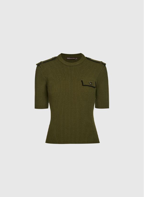 A Blusa é confeccionada em tricot, possui caimento acinturado, gola redonda canelada, martingale nos ombros, mangas curtas, lapela decorativa frontal e acabamento canelado.