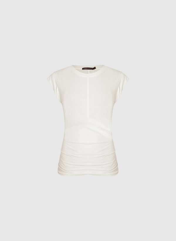 A Regata é confeccionada em malha, possui caimento acinturado, gola redonda, alças largas com detalhe dobrado, detalhe drapeado nas laterais e acabamento pespontado.
