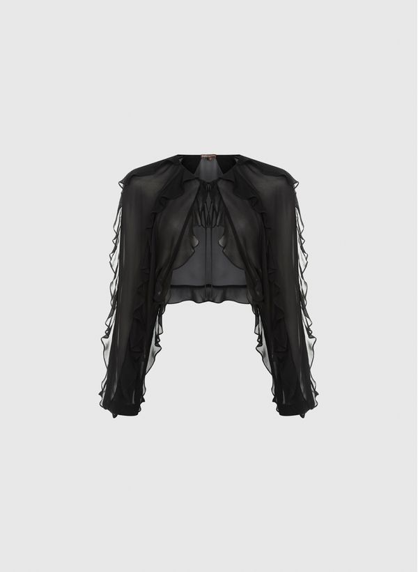O Bolero é confeccionado em georgette de viscose, possui transparência, gola redonda, mangas longas, babados aplicados, cordão para amarração e acabamento pespontado.