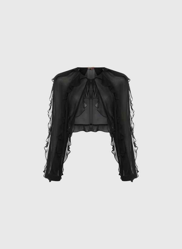 O Bolero é confeccionado em georgette de viscose, possui decote em amplo, mangas longas, babados aplicados, amarração frontal para fechamento e acabamento pespontado.