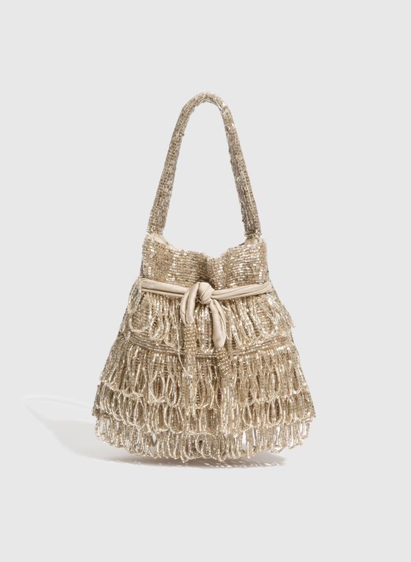 A Bolsa é confeccionada em tecido com aplicações de vidrilhos, possui modelo bucket, alça de mão fixa, alça longa removível, forro interno e fechamento por cordões.