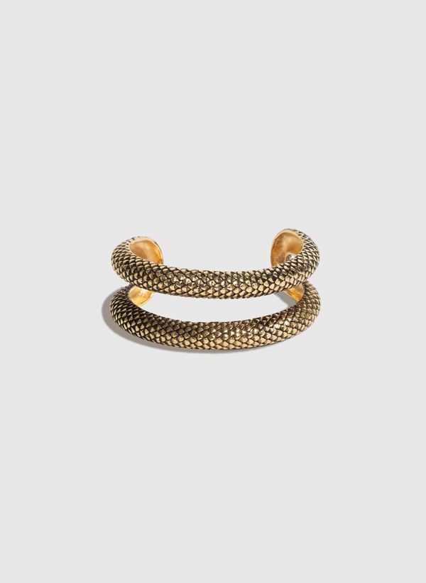 O Bracelete é confeccionado em metal com banho ouro vintage, possui liga de alumínio e não há fechamento.