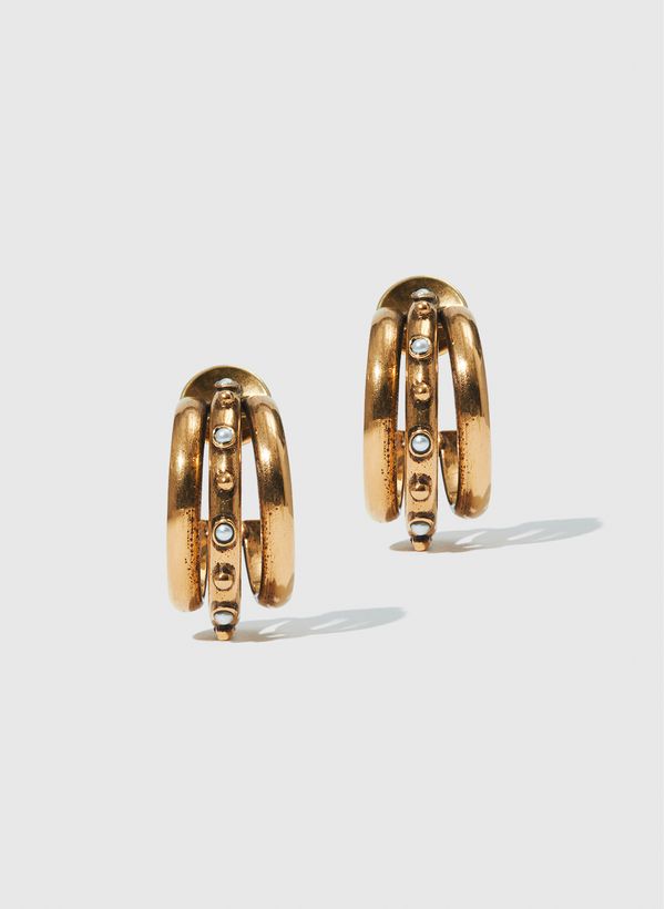 O Brinco é fabricado em zamac com banho dourado vintage, possui formato de argola tripla com mini bolinhas na superfície central, comprimento médio e fechamento posterior por tarraxa.