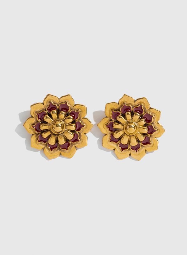 O Brinco é fabricado em metal com banho dourado, possui formato de tripla flor com detalhe em resina, superfície em relevo e fechamento posterior por tarraxa.