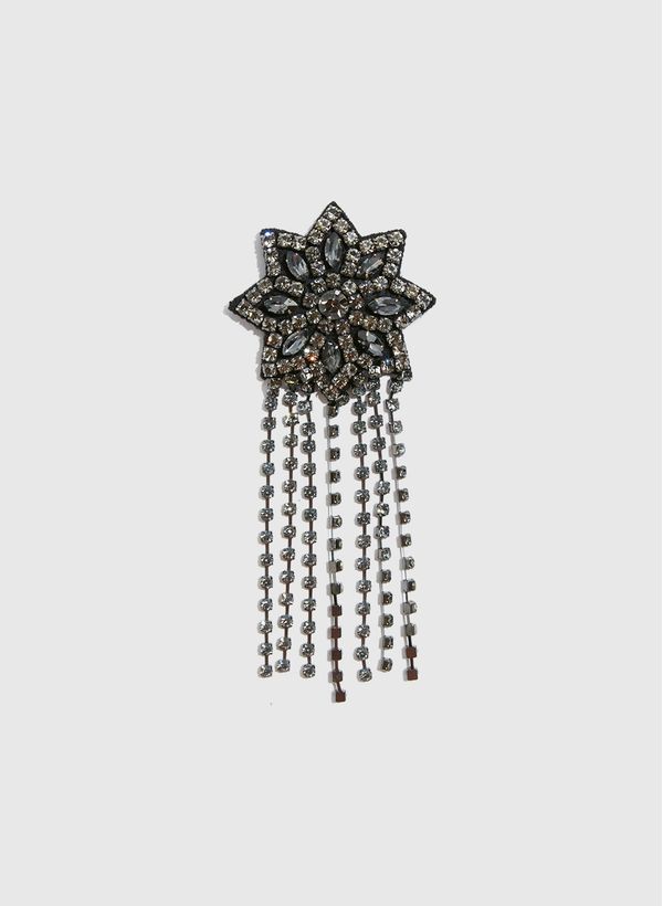 Confeccionado com aplicação de strass, tiras soltas e alfinete para fixação na roupa.