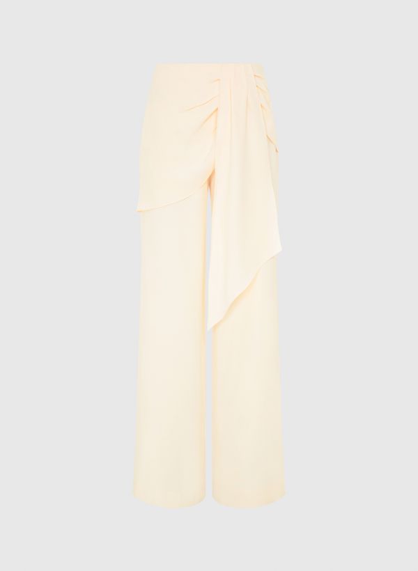 A Calça é confeccionada em crepe, possui modelagem em alfaiataria, recorte frontal com sobreposição assimétrica e detalhe drapeado aplicado, dois bolsos posteriores embutidos, fechamento lateral por zíper invisível, e acabamento pespontado.